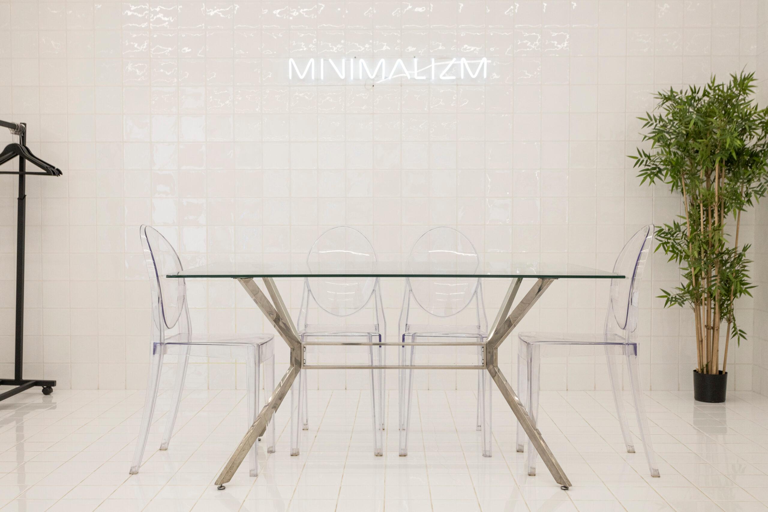 Белый зал с уникальным интерьерным решением. Встроенное светодиодное освещение позволяет изменить цветовую гамму по RGBW – каналам – CRI 91 и заполнить зал любым оттенком. В зоне с белой плиткой находится большой стеклянный стол, искусственные растения и неоновая вывеска с текстом MINIMALIZM. В основной части зала расположены белоснежный диван, стена с диммируемой подсветкой, а также пластиковые панели с подсветкой, и зеркало с внутренней светодиодной подсветкой.