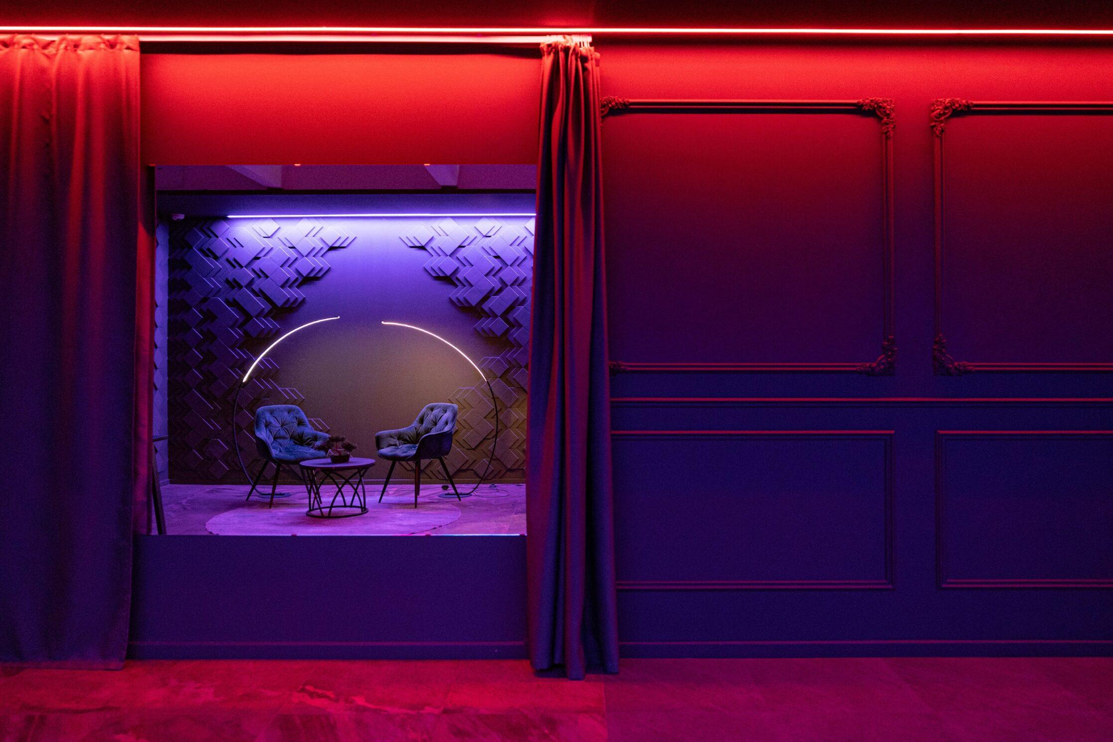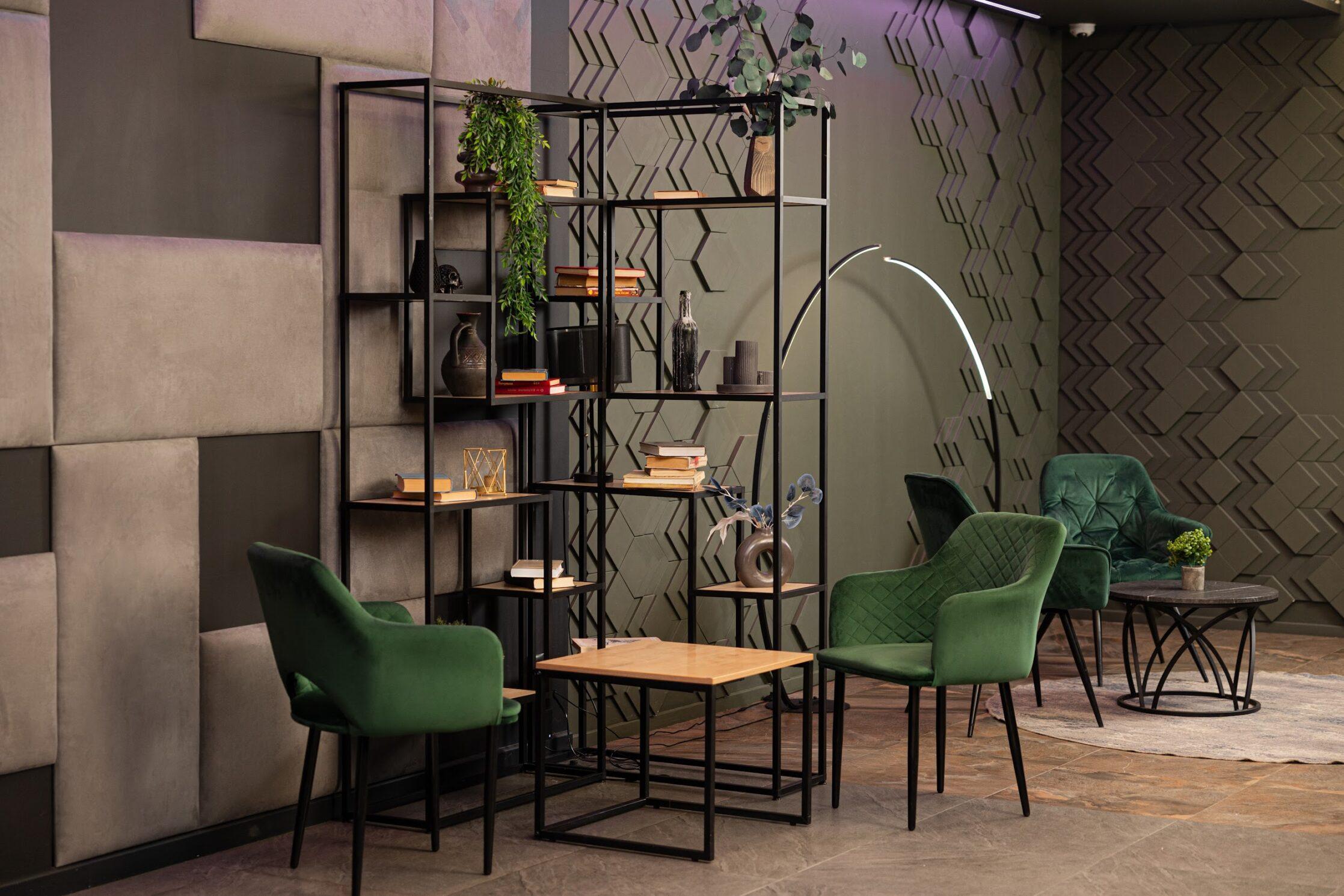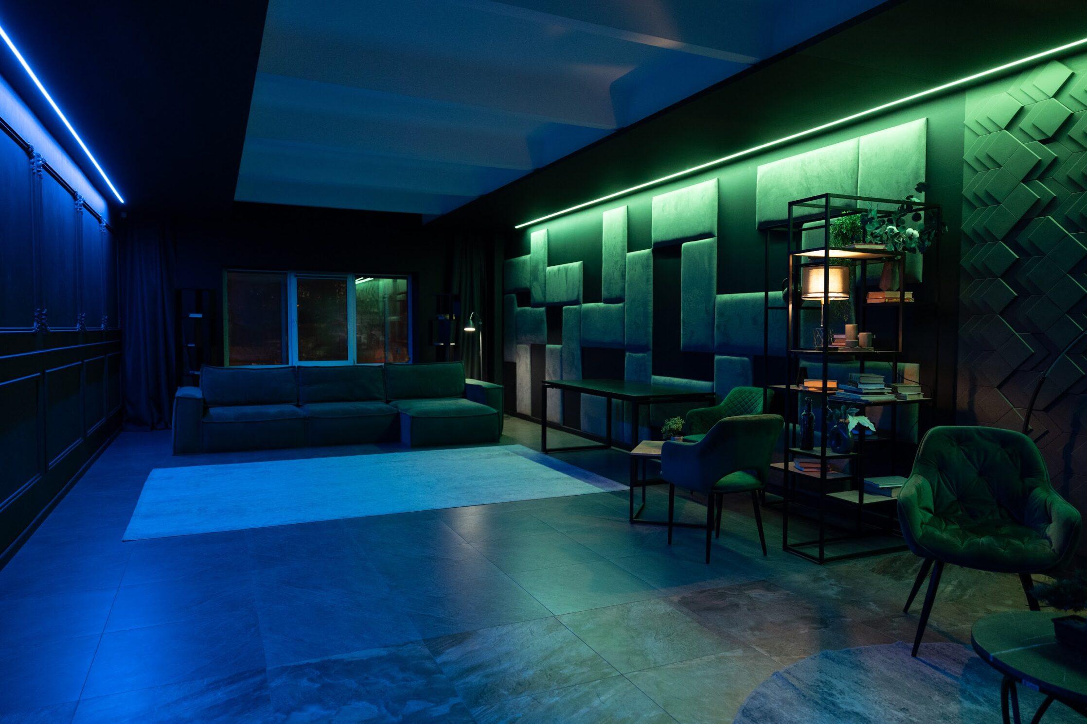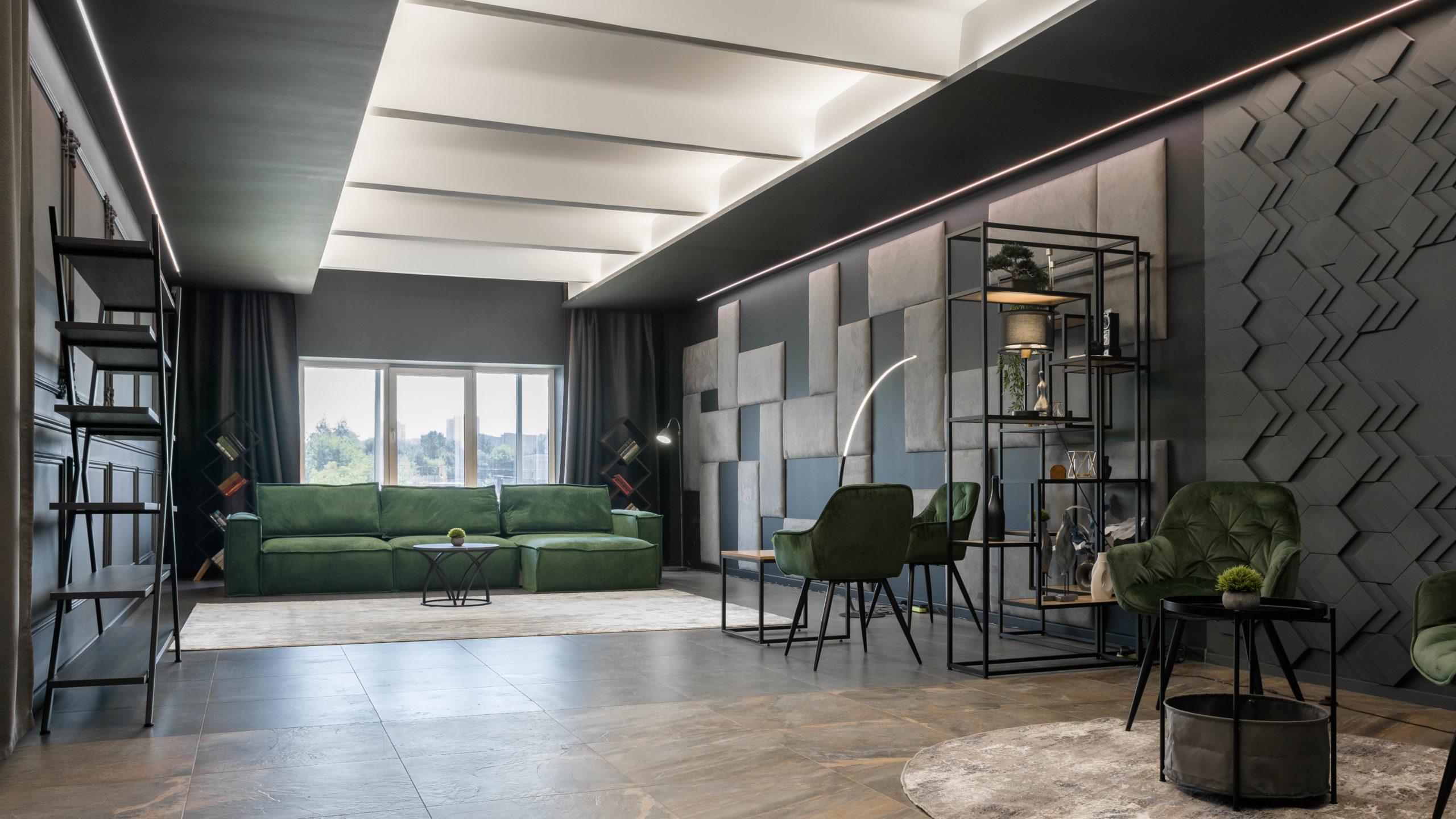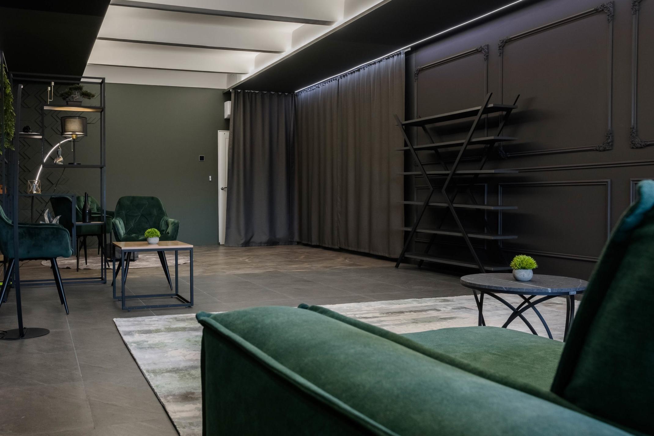 Просторный, темный зал разделенный на две зоны. Подкаст подходит для любых видов съемок благодаря разноплановому интерьеру и приятной атмосфере. Основная часть располагает в себе длинный, зеленый диван несколько стеллажей, торшеры и стулья, а также два небольших кофейных столика. Отделка стен по одной стороне выполнена в классическом стиле, создавая уникальное и экстравагантное пространство, для воплощения фото и видео проектов. На второй стороне стены с мягкими и жесткими стеновыми панелями.