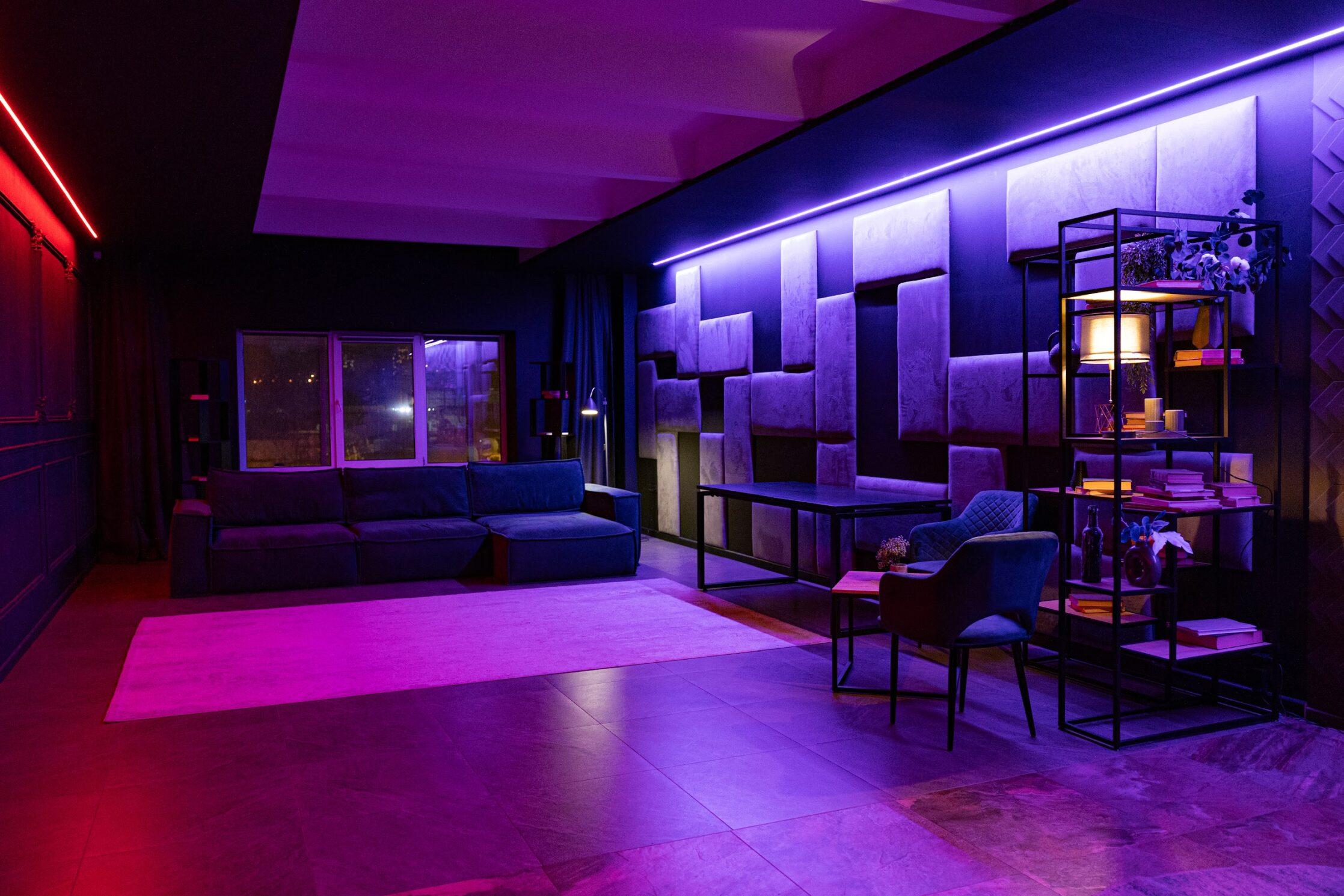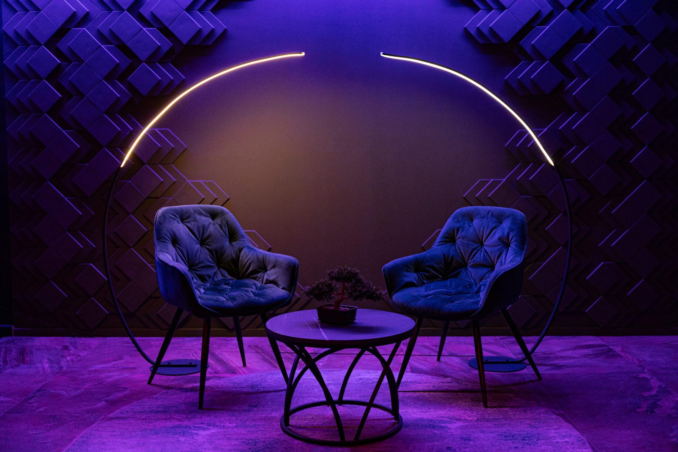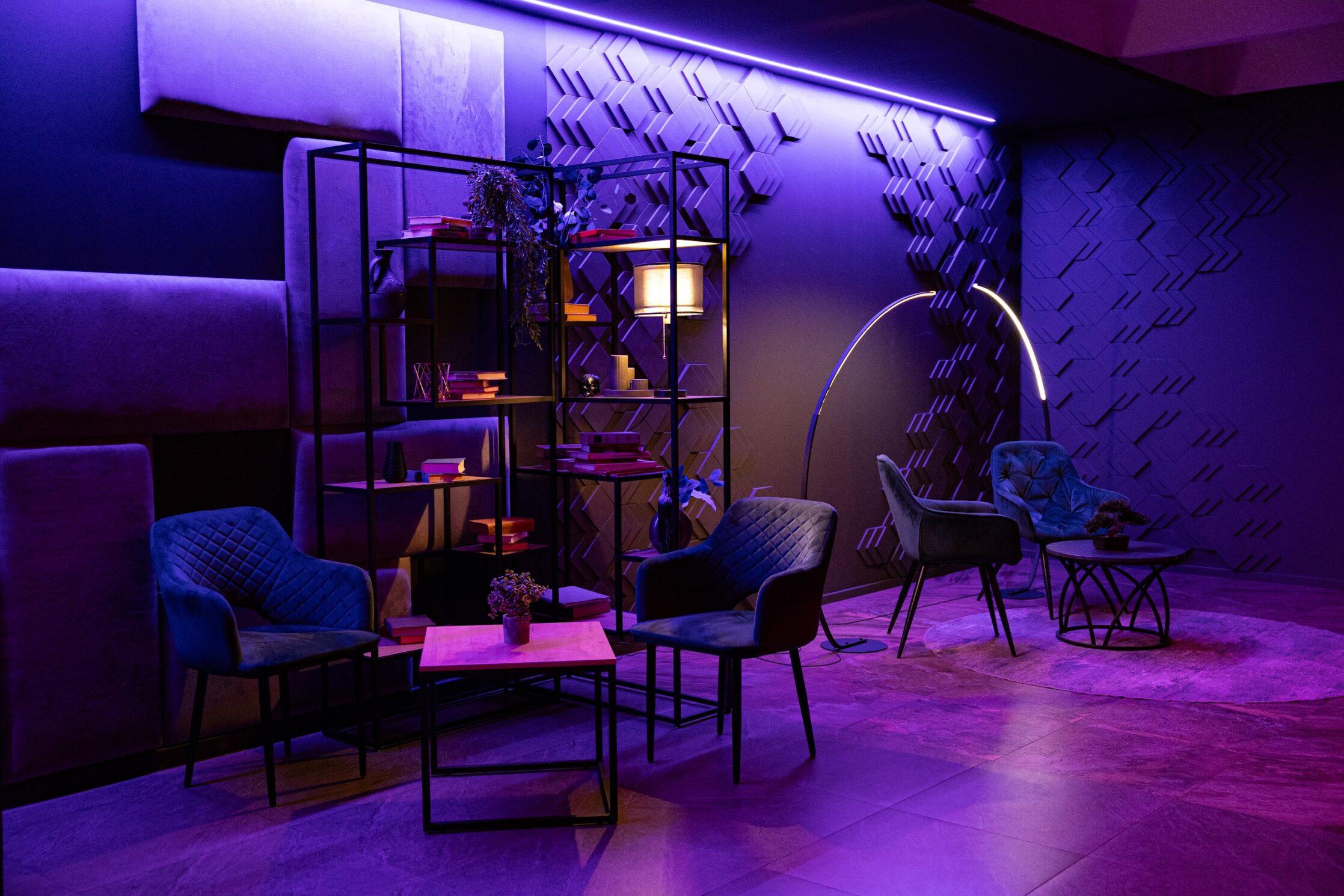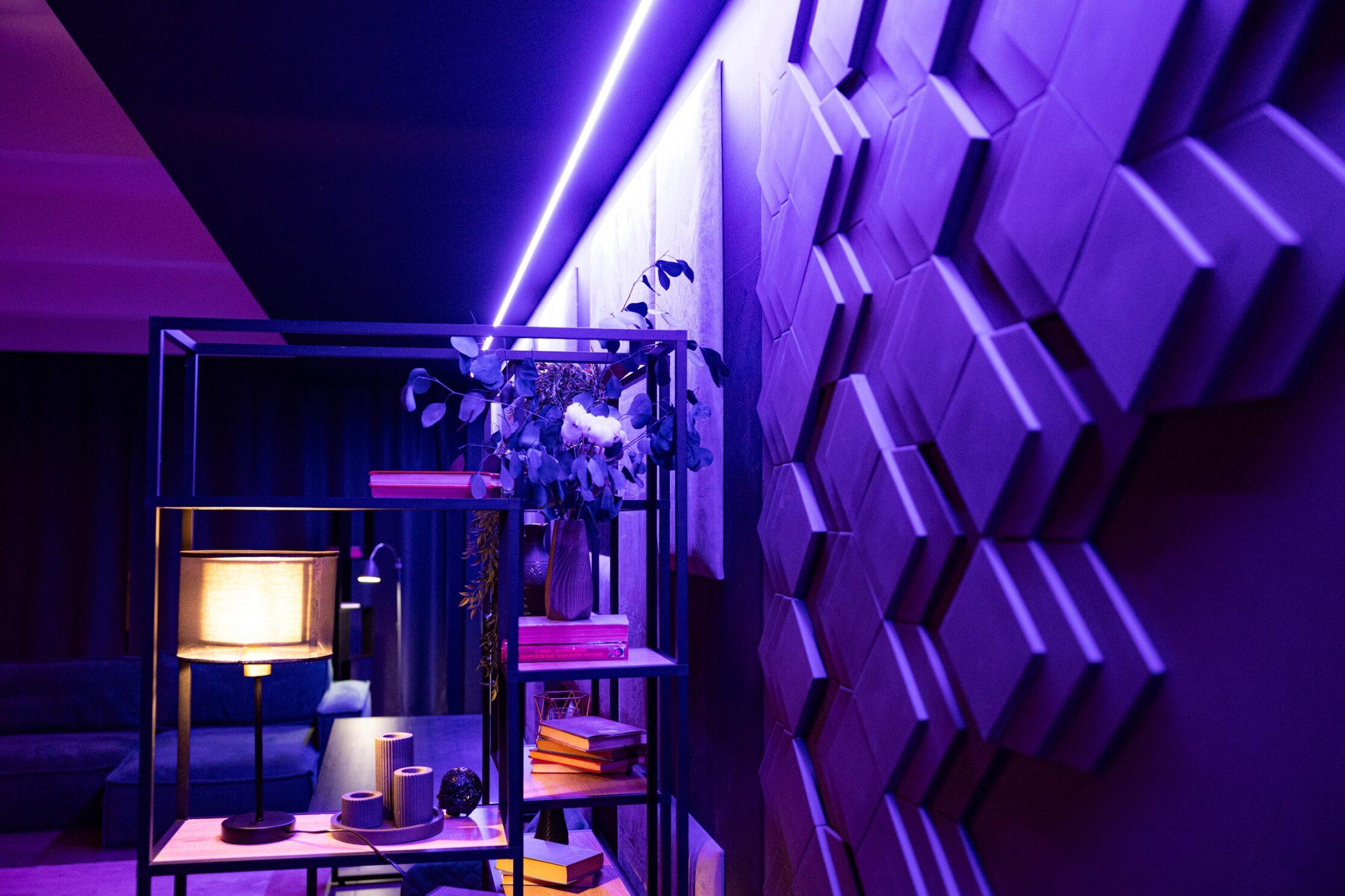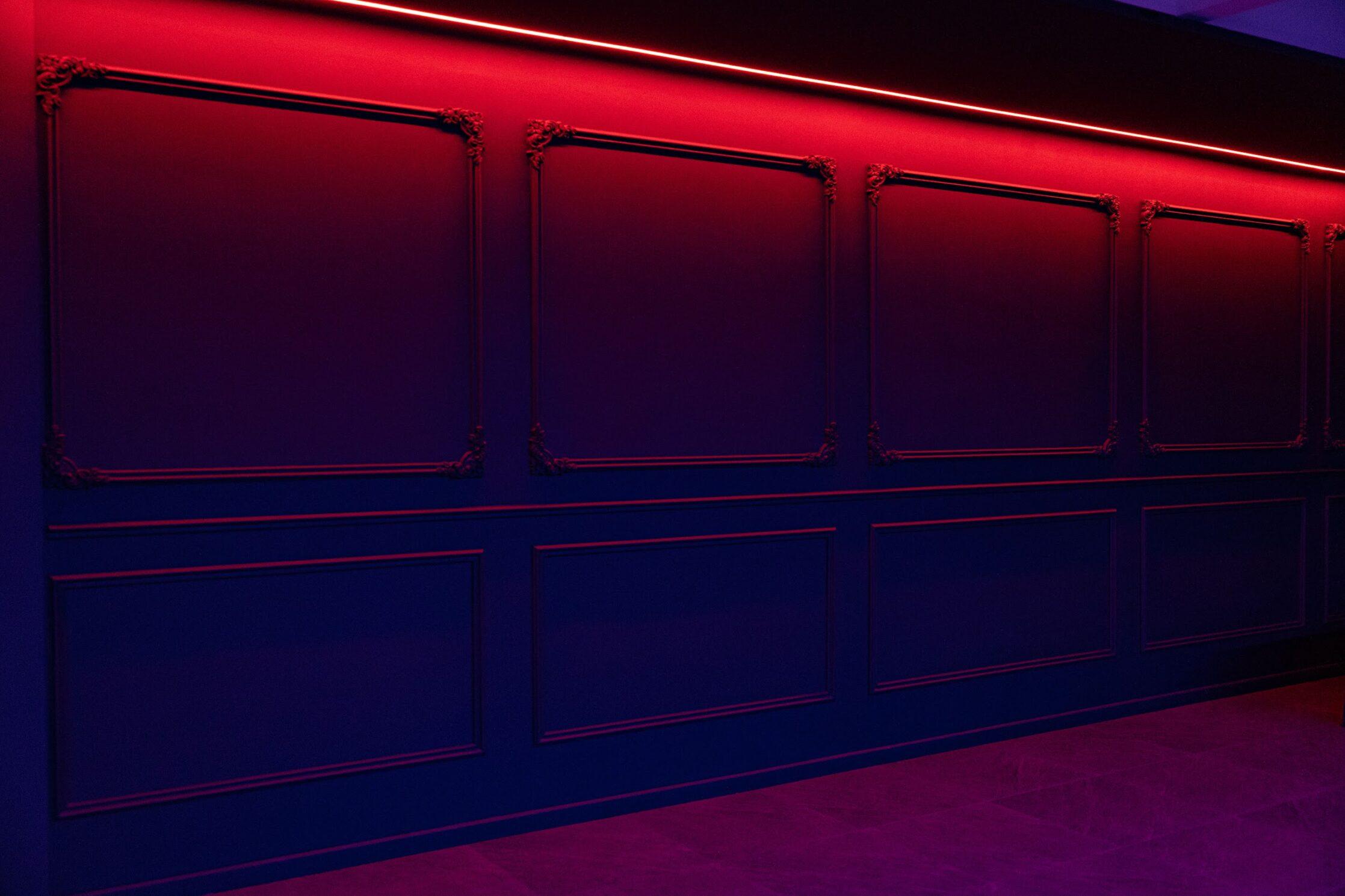 Просторный, темный зал разделенный на две зоны. Подкаст подходит для любых видов съемок благодаря разноплановому интерьеру и приятной атмосфере. Основная часть располагает в себе длинный, зеленый диван несколько стеллажей, торшеры и стулья, а также два небольших кофейных столика. Отделка стен по одной стороне выполнена в классическом стиле, создавая уникальное и экстравагантное пространство, для воплощения фото и видео проектов. На второй стороне стены с мягкими и жесткими стеновыми панелями.